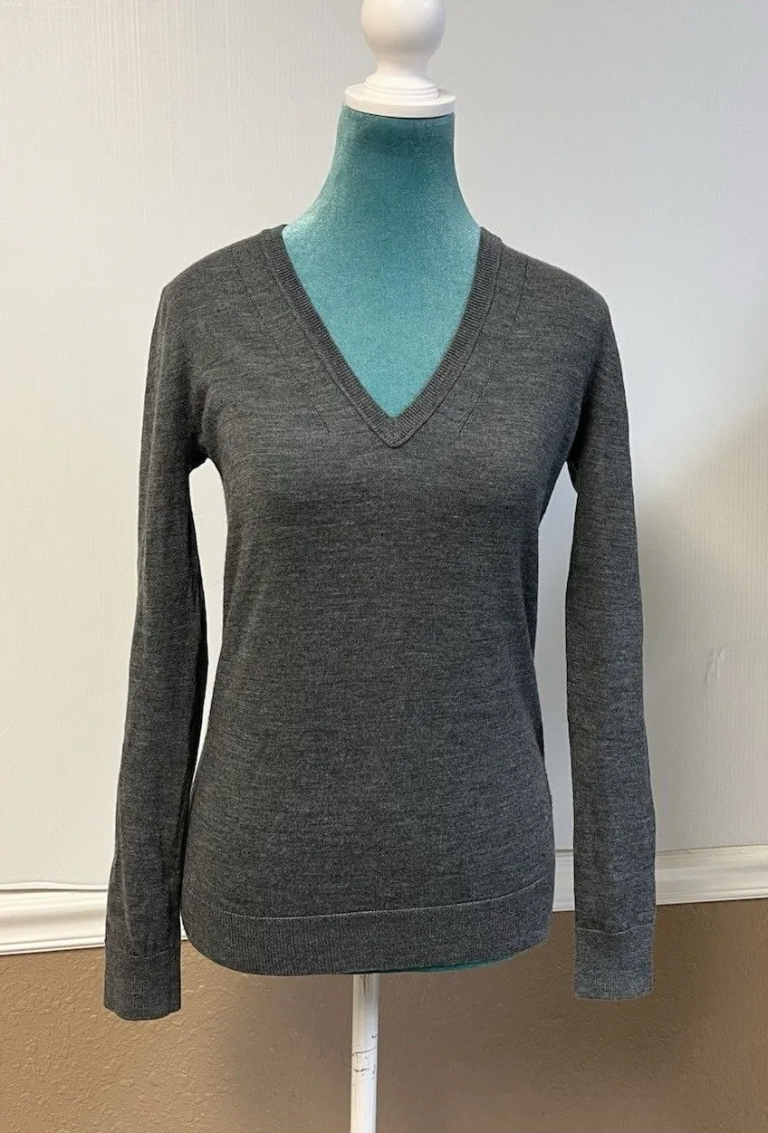 Elevated and timeless Burberry Brit Merino Wool V-Neck Sweater in Size Small. Crafted from ultra-soft, high-quality merino wool, this luxury knit features a classic charcoal grey shade and the signature embroidered Burberry logo at the chest.