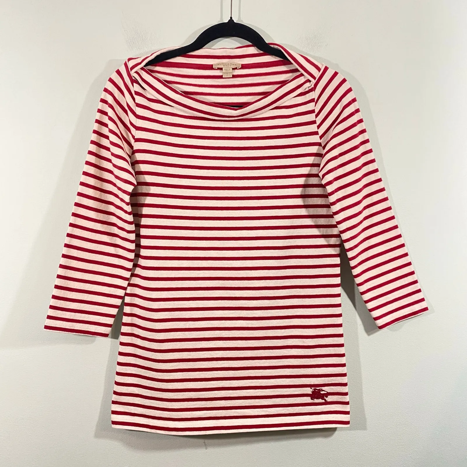 Burberry Brit Women Red & Cream Striped Boat Neck Quarter Sleeve Top - Size S - Good pre-owned condition, very light stain above the logo - Pleaser refer to pictures for exact condition - Measurements: armpit to armpit: 17, length: 25, sleeve length: 18.5 All measurements were taken with product flat lay Please refer to pictures for material content Feel free to contact me for more pictures or questions