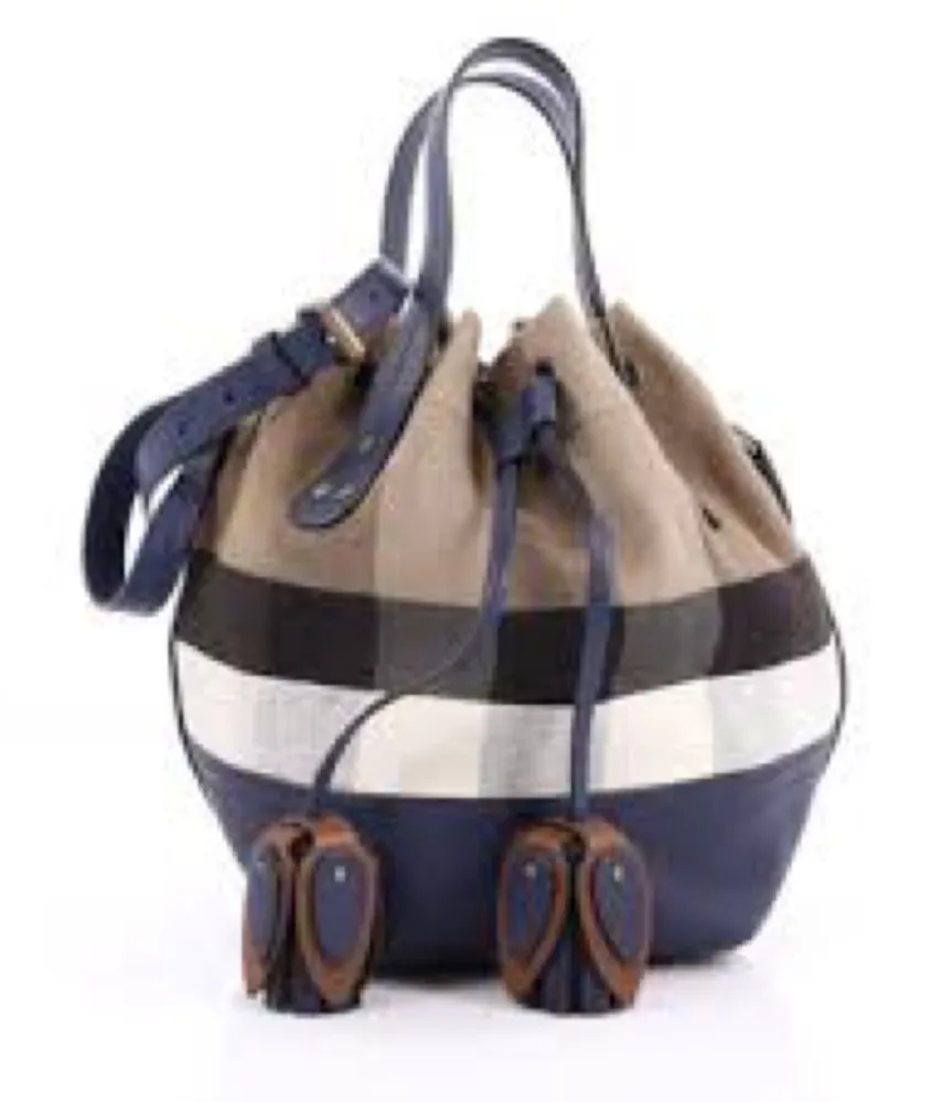 Burberry house check Heston bucket bag blue tan canvas & leather flower tassels Shows wear/holes a... Show more