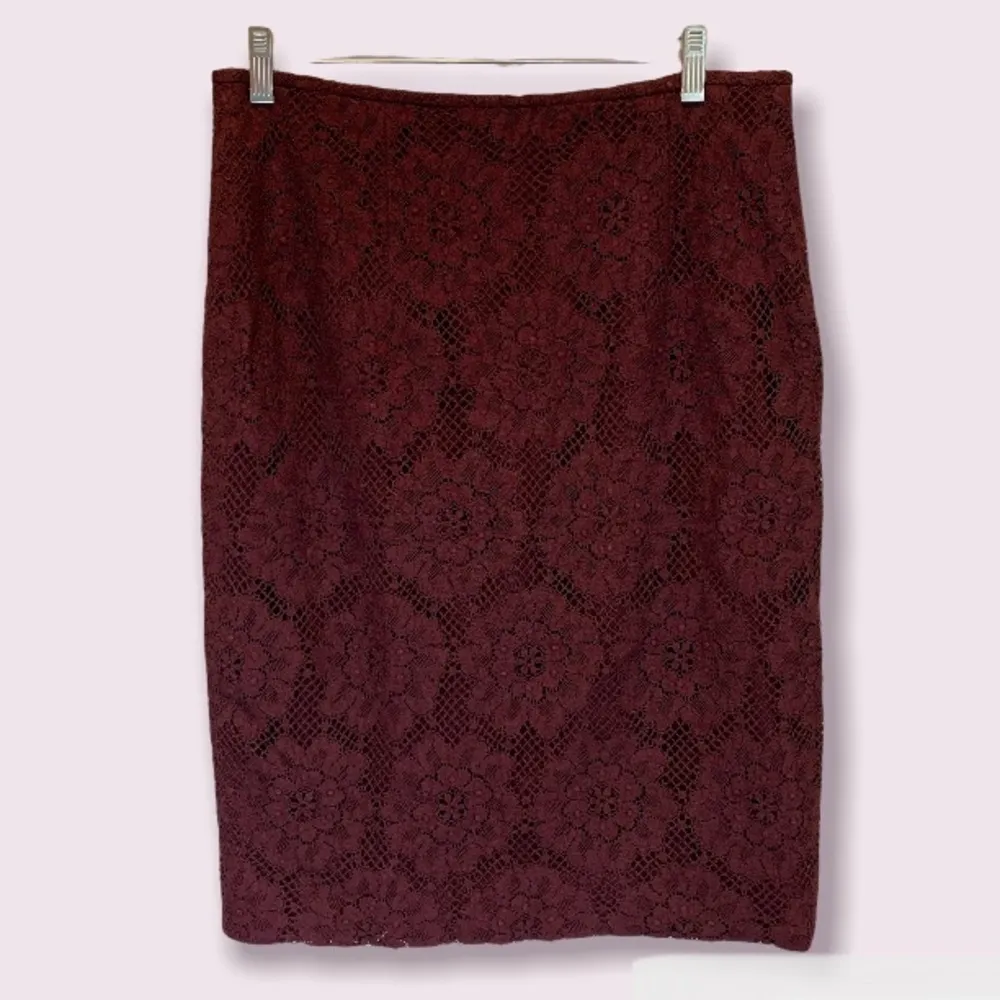 Burberry London Lace Pencil Skirt Size 14 Plum, Maroon, Burgundy with floral lace overlay Line... Show more