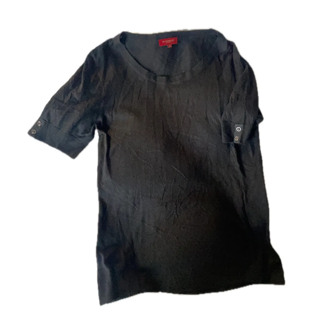 BURBERRY LONDON women's top crafted from a modal and angora blend. This V-neck top features short sleeves with decorative button details at the cuffs. Measurements: • Chest: 23 1/2 in • Shoulder to Shoulder: 12 3/4 in • Sleeve Length: 10 1/4 in • Length: 16 1/2 in Type: T-Shirt Department: Women Style: Tunic Material: Modal, Angora Neckline: V-Neck Sleeve Length: 3/4 Sleeve Sleeve Type: Classic/Fitted Sleeve Pattern: Solid Accents: Button Features: Stretch Fit: Regular Fabric Type: Knit Occasion: Casual Closure: Pullover Season: Spring, Fall Unit Type: Unit Keywords: Burberry, London, Womenswear, Modal, Angora, V-neck, Button Cuff, Short Sleeve, Dark Gray, Knit Top, Designer, Luxury, Comfortable Open to Ofers!