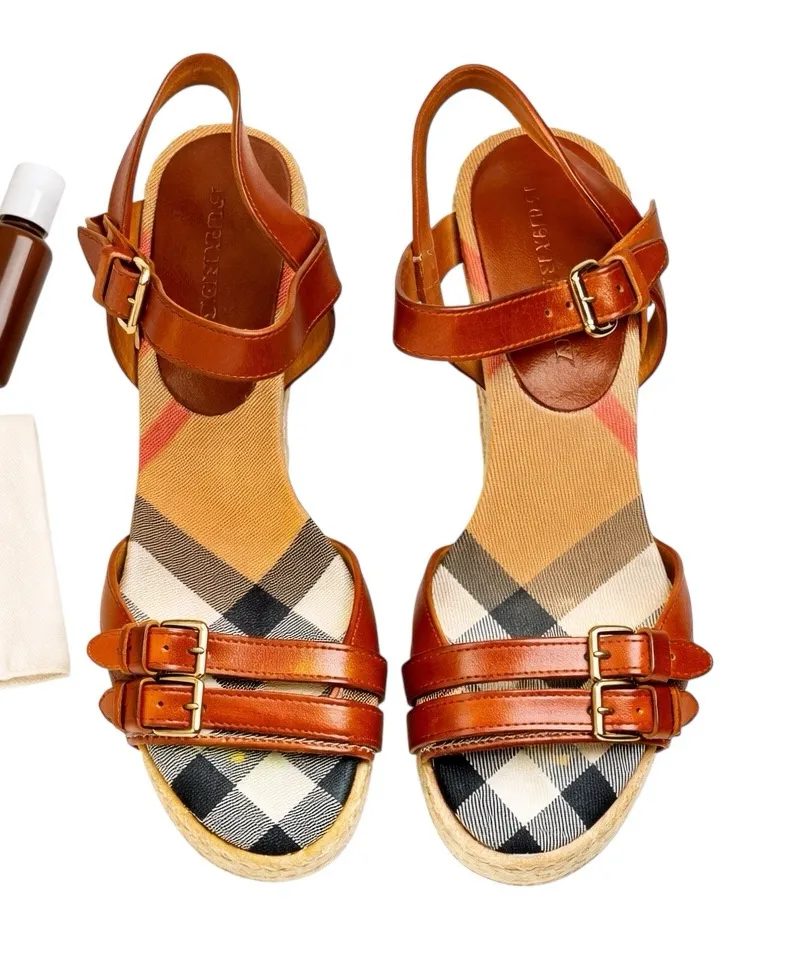 Burberry Tan Leather Check Canvas Espadrille Wedge Sandals Italy Size 35 First photo is STOCK photo... Show more