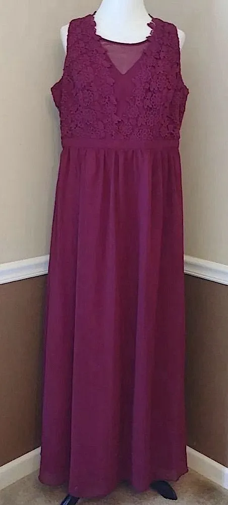 Chi Chi London "Elegance Again" burgundy maxi dress. Satiny lining with chiffon overlay and crochet lace detail. V cut bodice with sheer insert at the neckline. Back zipper. Sheer panels. Purchased new but laundered to remove marks from warehouse storage. Sold Out at Modcloth Size US 16 Approximate measurements are taken across the item laid flat: Bust: 22 inches Waist: 19 inches Length: 59 inches Shell: 100% Polyester. Lace: 100% Polyester. Lining: 95.1% Polyester,4.9% Elastane. Fabric does not stretch, lining stretches. Clean, smoke-free home and studio. 5 star seller. Super fast shipping! formal, elegant, evening wear, black tie, cocktail, prom, ball, dance, dressy, special occasion, homecoming, red carpet party SKU#B1565 20B