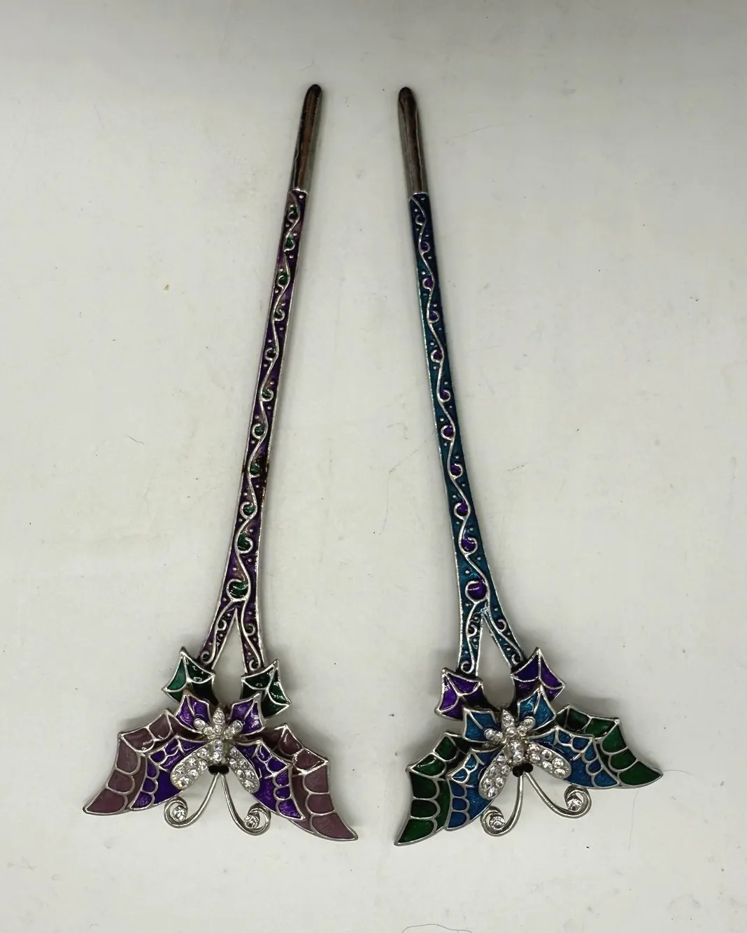 Item: Set of 2 decorative hair sticks for women and teens. Condition: Pre-owned set of 2 hair sticks with light surface wear and some tarnishing at the metal tips. Enamel color and rhinestones are intact and bright on both sticks. No original packaging included. Type: Hair sticks with butterfly theme, suitable for all hair types and updo styles. Material: Silver-tone metal with multicolor enamel detailing and clear crystal rhinestone accents. Design: Butterfly tops with sparkly rhinestone bodies and bows, slim shafts with multicolor geometric enamel pattern along the length. Color: Multicolor mix including green, blue, purple, and silver-tone metal. Details: Coordinating pair, works as a set for securing buns or decorative hair styling, no brand markings or original packaging visible. Keywords Only: glam asian anime regal gasha