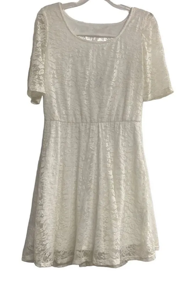 BRAND: By & By SIZE: Large but I believe it may run smaller. SO: Please see approximate measurements in pictures before purchasing. Use your own judgment as to the fit. COLOR: Cream CONDITION: Pre Owned MEASUREMENTS: See Pictures MATERIAL: Dress: 92% Nylon, 8 % Spandex Lining: 100% Polyester OTHER DETAILS: Hand Wash Length Of Dress: 35.5 Cut-Out in back Round Neckline Short Sleeves Lace Has belt loops but NO belt Fit & Flare Wedding, Special Occasion, Graduation, Date Night