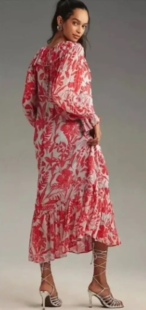 By Anthropologie Size medium women's US Long sleeve v-neck chiffon dress in light grey with red flor... Show more
