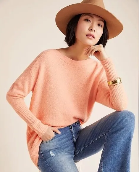 Keywords: Anthropologie sweater, knit pullover, boat neck sweater, long sleeve sweater, peach sweater, women's sweater, casual sweater, cozy sweater, small sweater, nylon blend sweater, relaxed fit sweater, fall sweater, winter sweater, lightweight sweater