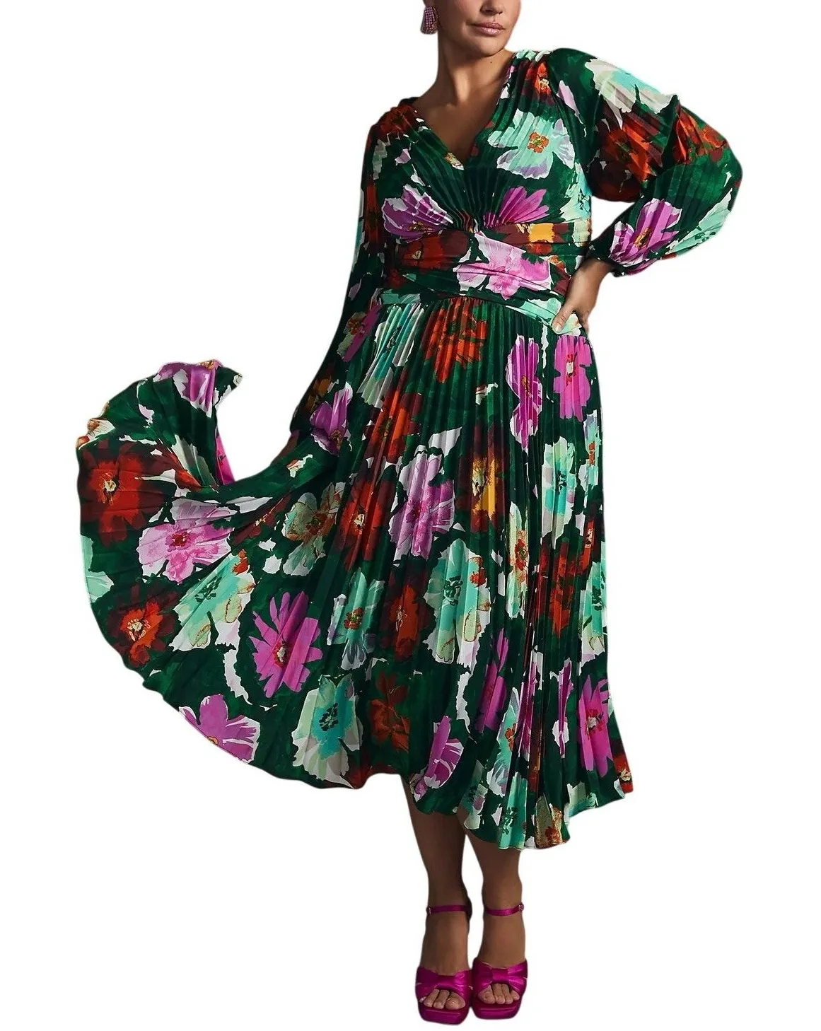 By Anthropologie Pleated V-Neck Dress Size 14P New without Tag MSRP $220 Sold out online Style No. 4130370060122 Polyester; viscose lining Back zip Dry clean Imported Petite: Falls 47" from shoulder