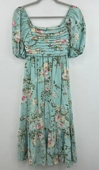 By The River Blue Floral Dress Square Neck Puff Sleeve Smocked Tiered Romantic Pre-Owned in Excellen... Show more