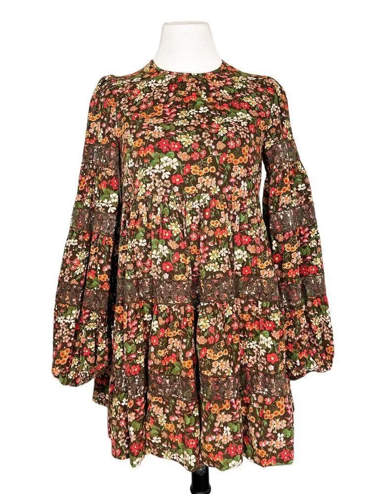 Crafted from a lightweight and non-stretch corduroy fabric, this garment features delicate lace trim and a charming floral print. The design includes gathering detail around the round neckline, long balloon sleeves with elastic cuffs, and a convenient button keyhole at the back. On-seam side pockets add practicality to the piece. The shell is composed of 100% cotton, ensuring both comfort and style. COLOR: Winter Field - Brown with yellow, cream, orange red, green SIZE: XS CONDITION: NWOT - new without tags FLAWS: There's a small tear near the keyhole on the back of the dress that looks to have been attempted to be sewn up. It's not done correctly, but could be corrected. Since the pattern is so busy, having it repaired would be easy and probably not very noticeable. TAGS: fall winter corduroy corded cord chord chorderoy corderoy ribbed lace laced tiered tiers peasant boho bohemian balloon sleeve thanksgiving retro 70's 70s seventies seventy hippie cute casual dressy work party church concert flowers floral garden by timo bytimo If measurements are provided, please note they are approximate and unstretched.