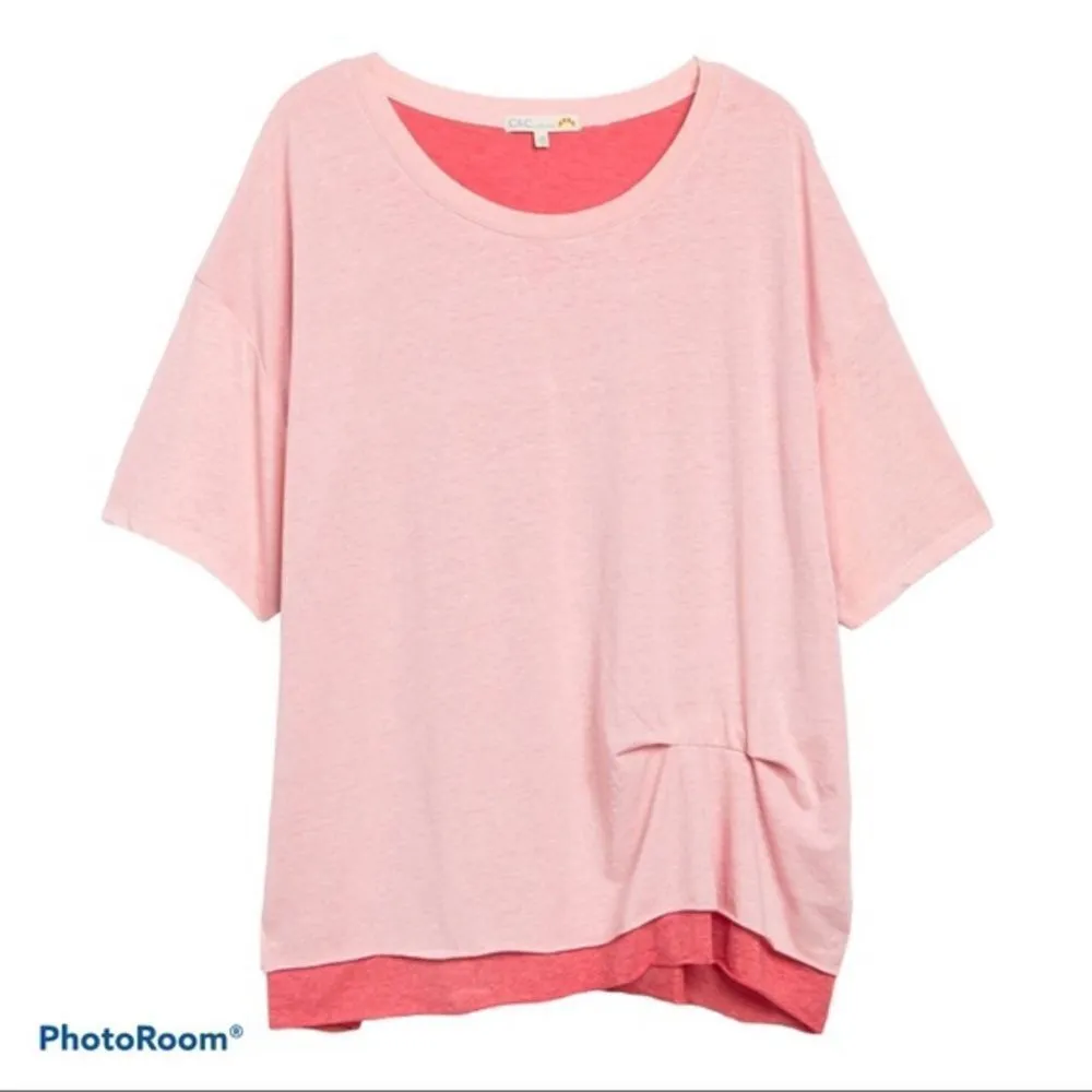 ✨ A double layered design adds contrast to this classic crew neck t-shirt that is finished off with a trendy side gather. - Crew neck - Short sleeves - Slips on over head - Side gather - Contrast hem - Knit construction - Approx. 25" length - Imported This item cannot be shipped to Canada. Size: Large ✨