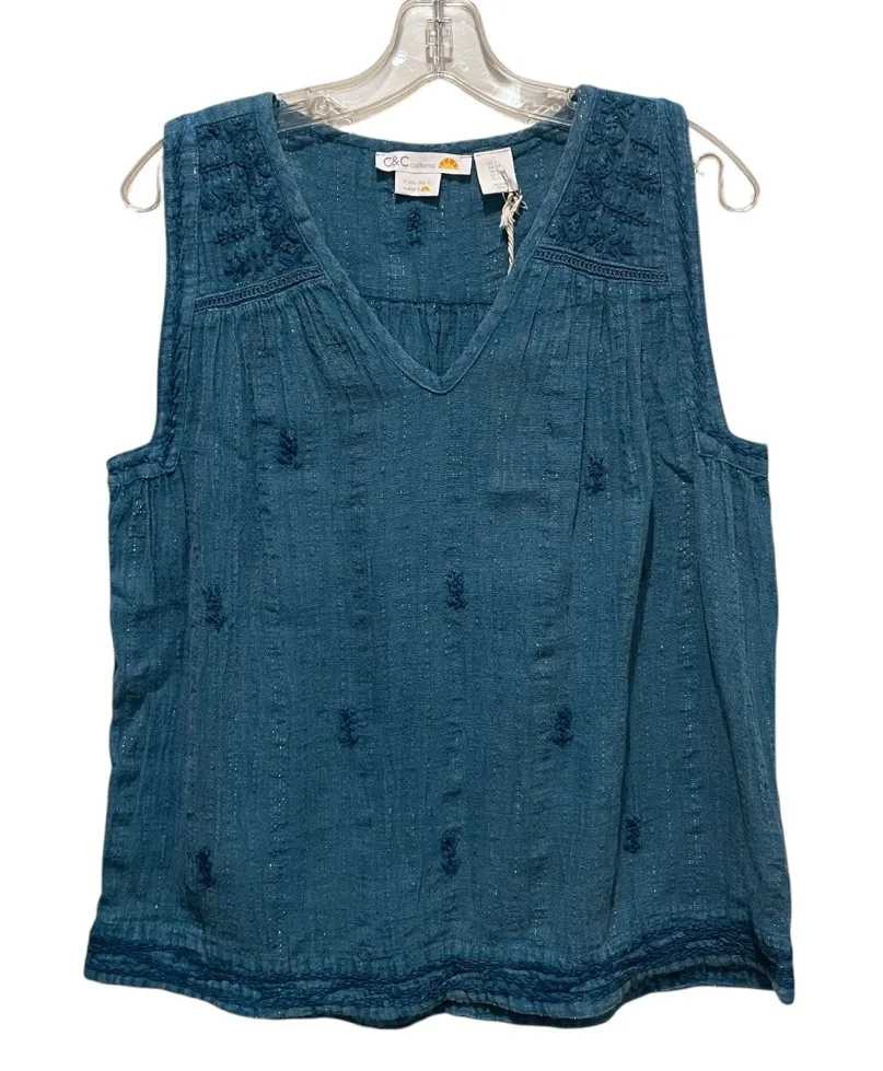 Beautiful C&C California sleeveless blouse with delicate embroidered detailing throughout. Lightweight textured cotton fabric with subtle shimmer threads. Features a flattering V neckline, gathered bust, and softly flared silhouette for an effortless boho look. Color: Teal Blue Size: Small Sleeveless V neckline Embroidered detailing Lightweight textured fabric Measurements (approximate, flat): Length: 24 inches Pit to Pit: 19 inches Condition: New with tags. 5 star seller! Will ship same or next day (except for weekends) Bundle to save!