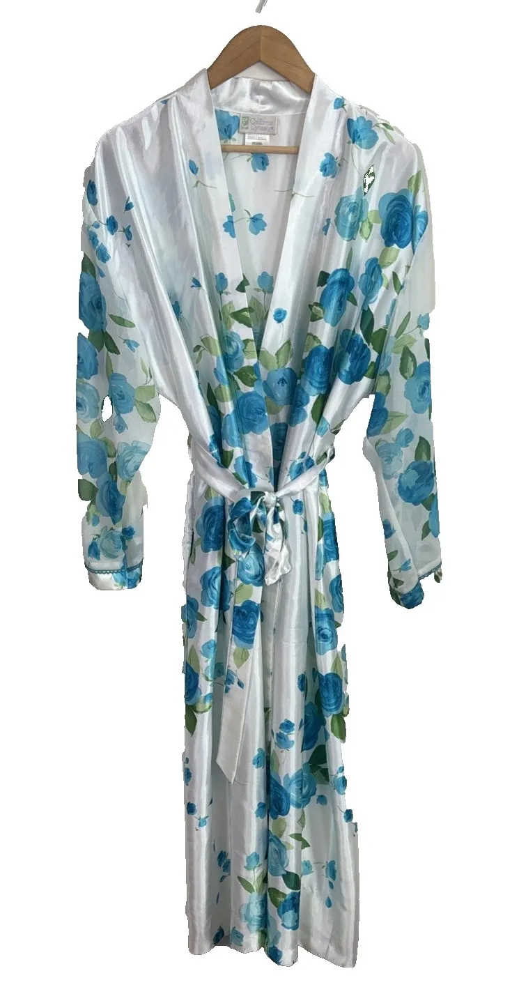 Vtg California Dynasty Womens Robe Sz L Satin Floral Long White Blue Tie Size L - $25 - From Krystal