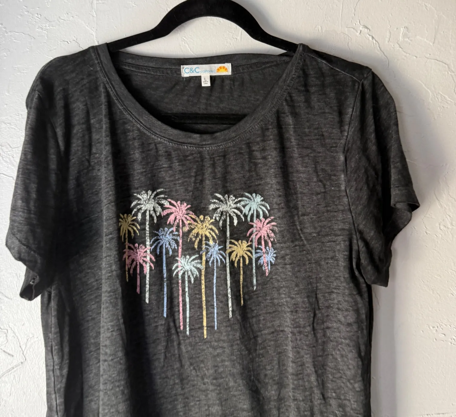 Measurements: • Chest: 19 in • Length: 24 in Type: T-Shirt Department: Women Style: Basic Material: Cotton Blend, Polyester Neckline: Crew Neck Sleeve Length: Short Sleeve Sleeve Type: Casual Sleeve Pattern: Floral Accents: Glitter Theme: Tropical, Florida Features: Lightweight, Stretch Fit: Relaxed Fabric Type: Jersey Occasion: Casual Closure: Pullover Keywords: C&C California, palm tree, graphic tee, women's t-shirt, charcoal gray, pastel colors, summer fashion, casual top, beach wear, vacation style, relaxed fit, crew neck, short sleeve