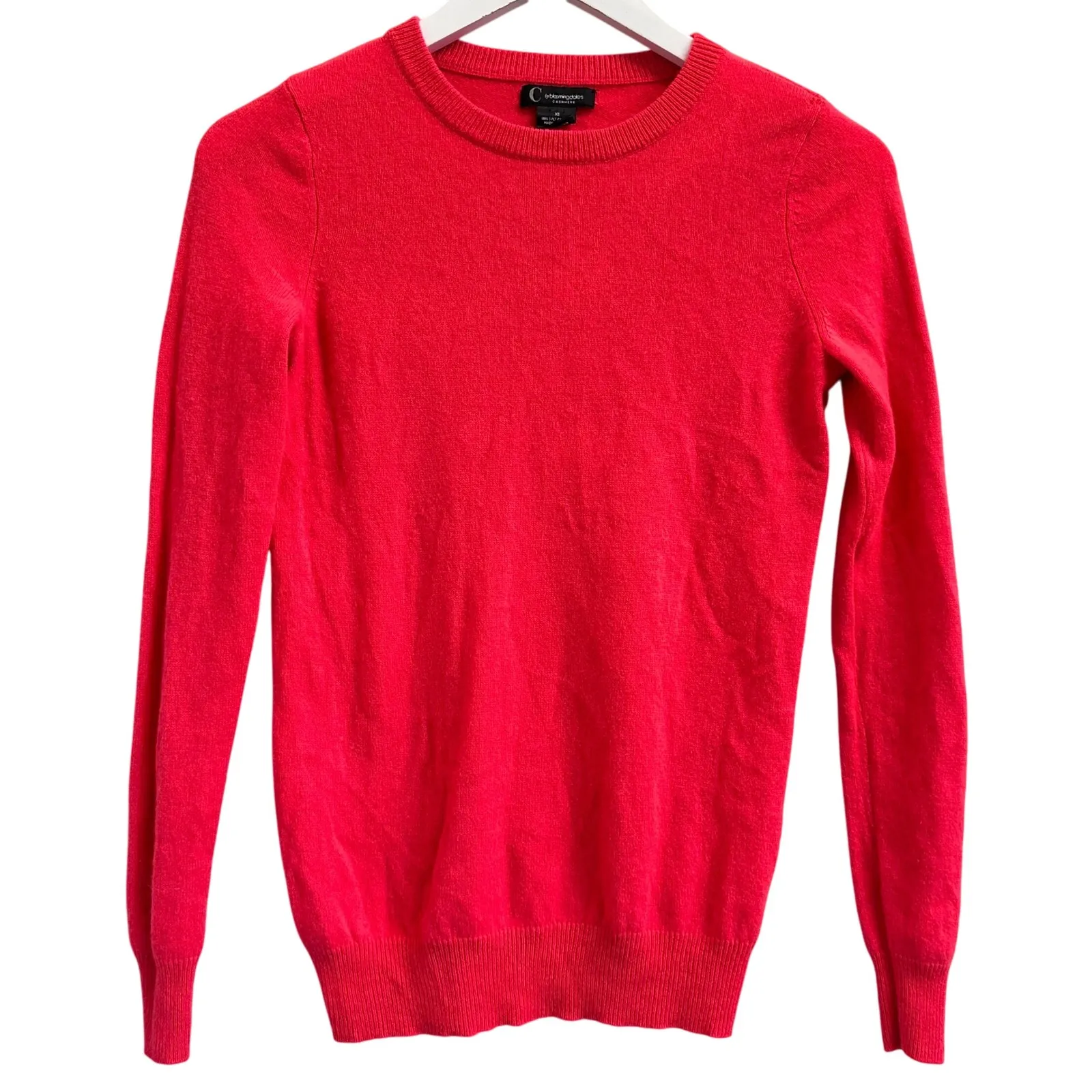 C by Bloomingdales Cashmere Sweater Womens Coral RED Crew Neck 2 Ply Pullover Size: XS Approximate measurements laying flat: Pit to Pit: 15" Length: 24" • All items come from a pet-free, smoke-free home. • Good Preowned Condition with a repaired spor seen in last picture Fast Shipping & Trusted Quality!