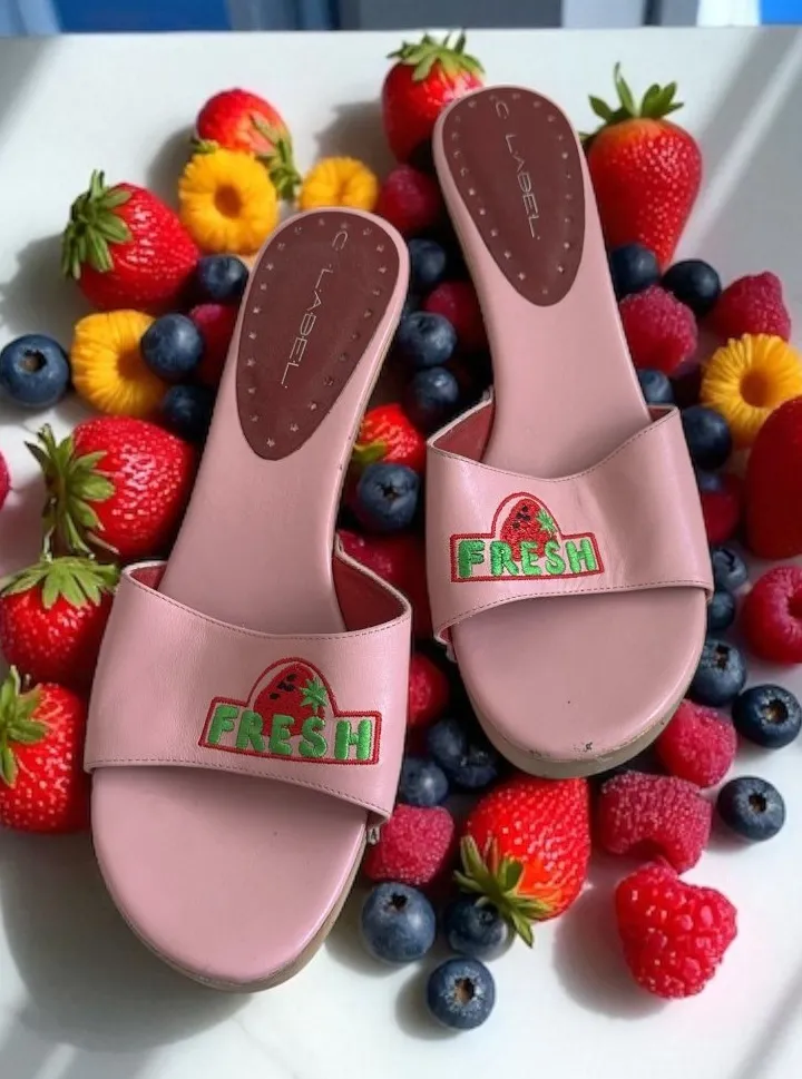 Step into the nostalgic elegance of Y2K fashion with these vibrant strawberry pink leather sandals.... Show more