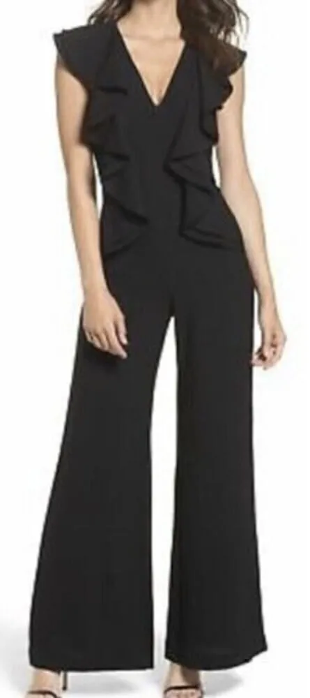 C/MEO Collective Metal Clouds Black Ruffle Sleeveless Jumpsuit Sz. M Retail $198 Excellent condition! Measurements Taken: 59"L, 29" inseam, 14.5" p/p (across chest), 13" waist (flat) Beautiful crepe jumpsuit by C/MEO Collective. This black v-neck jumpsuit has flutter sleeves, draped oversize ruffles down the bodice, and a flared hem. Fully lined, back zipper closure. The jumpsuit is 99% polyester and 1% spandex, so it has a bit of stretch to it if needed.