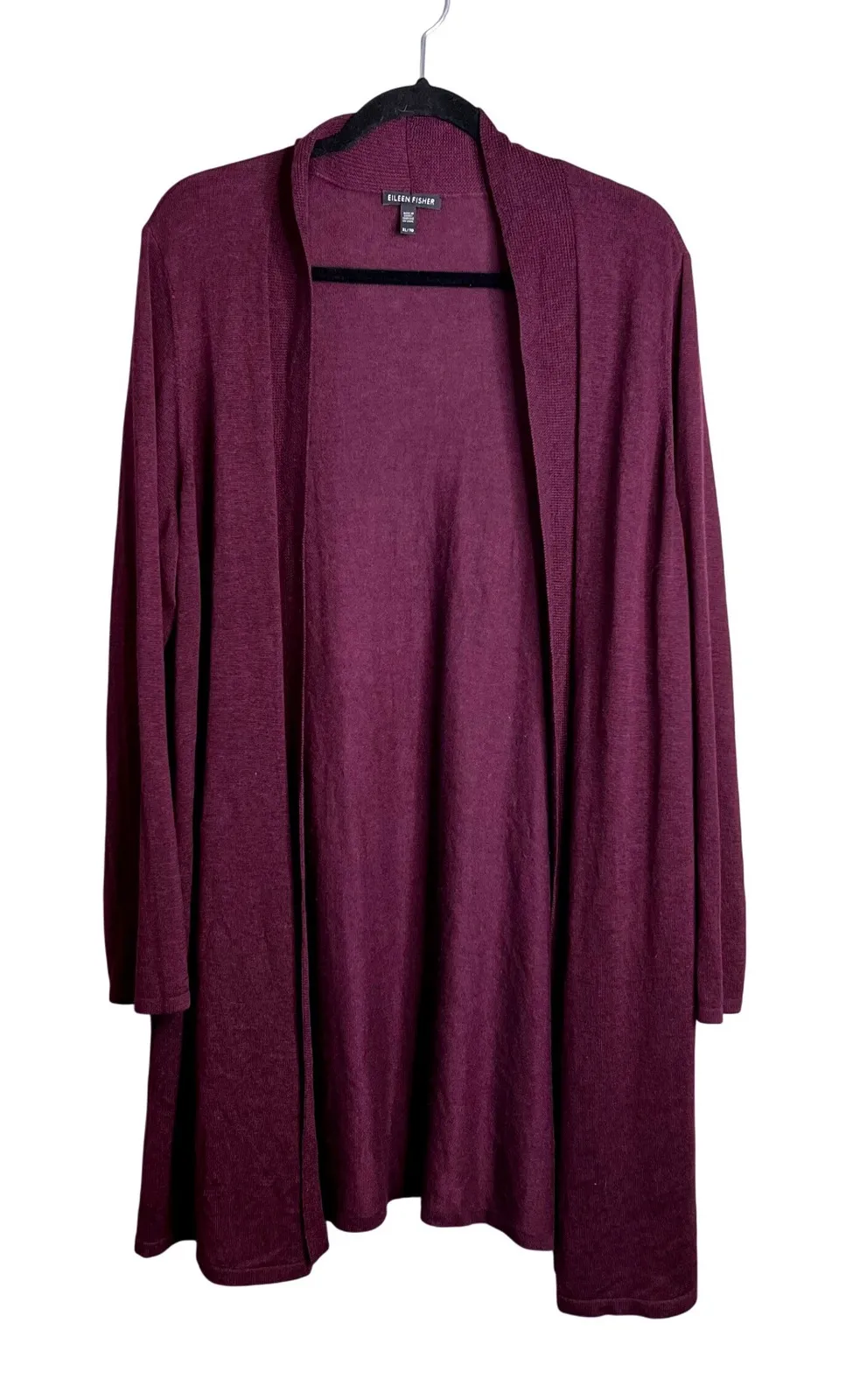 Keywords: Eileen Fisher, cardigan, sweater, open front, XL, extra large, tencel, wool, blend, plum purple, duster, long cardigan, knitwear, casual, layering, sustainable womens clothing