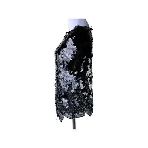 Black Silk top with bugle beading and black sequin discs. No labels or tags. Pull over. The bodice is solid black large sequin discs and the bottom has sheer cut outs with beaded trims. Measurements B = 38" W = 36" H = 41" - at hem of shirt L = 22.5" - from shoulder to hem