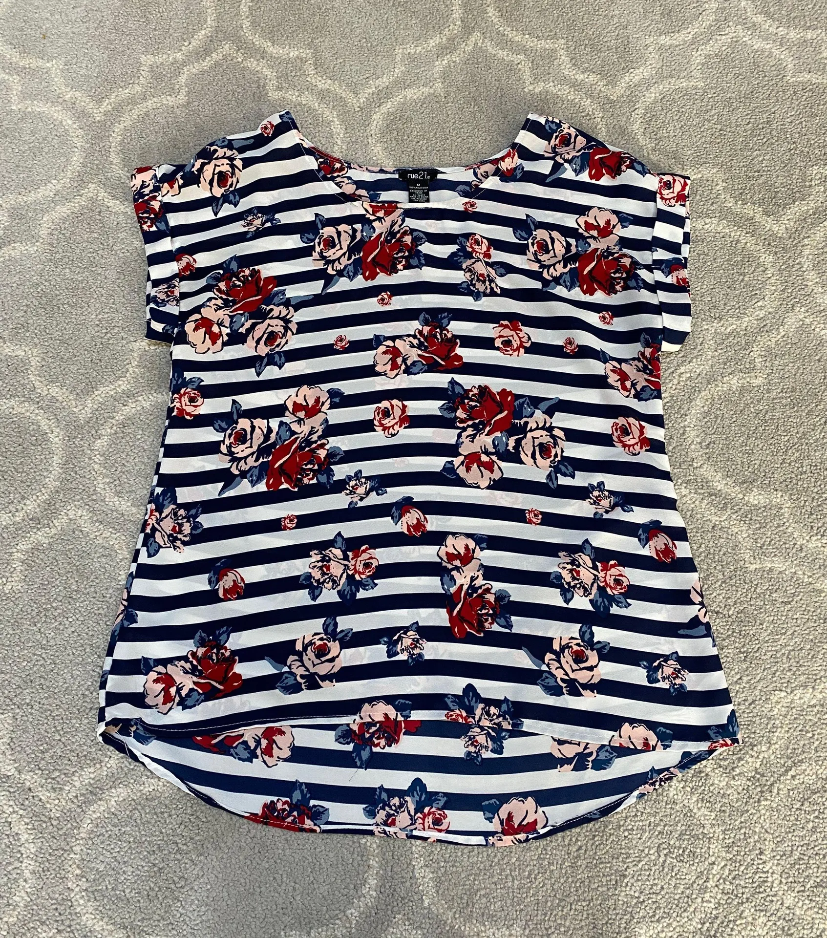 This stylish women's top features a vibrant floral pattern on classic navy and white stripes. Perfec... Show more