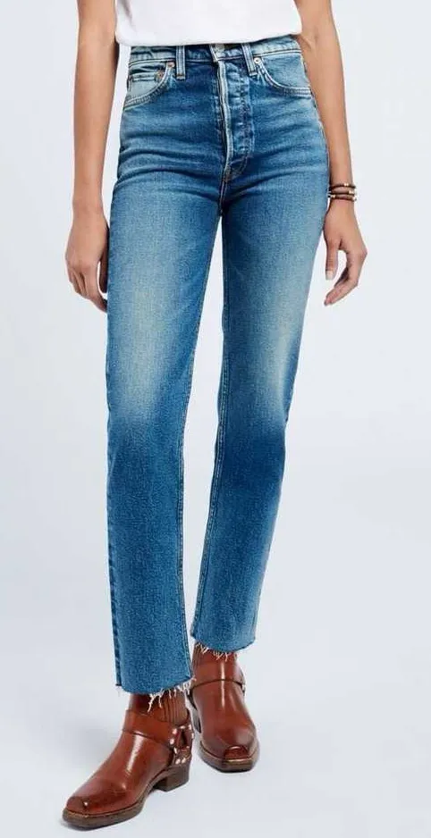 RE/DONE 70s Ultra High Rise Stove Pipe jeans in Broken In Dark, size 24. Stretch denim with straight leg, raw hem, and button fly for a classic fit. The RE/DONE 70s Comfort Stretch Ultra High Rise Stove Pipe in Broken In Dark reimagines vintage denim with a modern, flattering fit. Designed to sit ultra high at the waist and fall straight through the leg with a cropped raw hem for a worn-in, authentic look. Ultra high-rise. Straight leg, cropped ankle length. Classic button-fly closure. Raw hem detail. 5-pocket design. Relaxed fit. 96% Cotton, 3% Polyester, 1% Elastane. Machine wash. Excellent preowned condition. BRAND: RE/DONE SIZE: 24 COLOR: Broken in Dark WAIST: 13.5” RISE: 11.5” INSEAM: 25” LEG OPENING: 7” CONDITION: previously owned ORIGIN: Turkey Marked sizes will vary by designer • All measurements are approximate and taken flat in inches • Color may vary on your screen. •Fast Shipping •Small Business •Carefully Packaged, Smoke-Free •5-Star Seller Styling Ideas: Pair with a tucked-in tee or cropped sweater and boots for a modern vintage vibe. Perfect for everyday wear, from errands to casual outings.