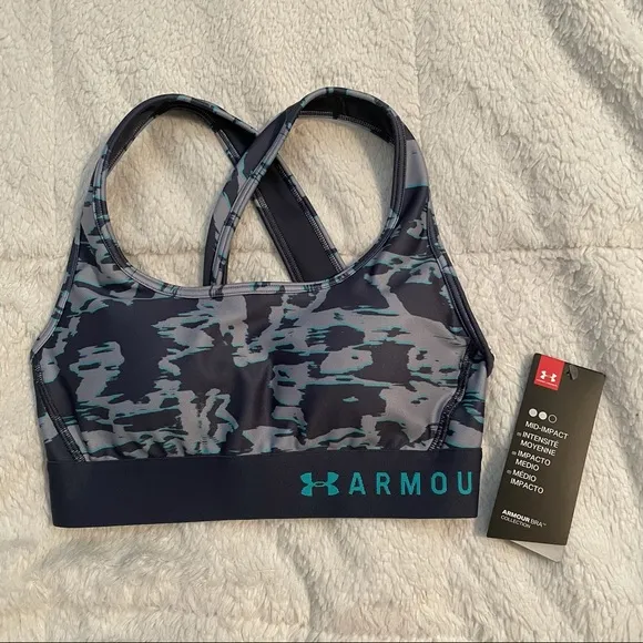 NWT. Under Armour Spirts Bra in a size XS. Mid impact. Blue Camo color. Removable bra cups.