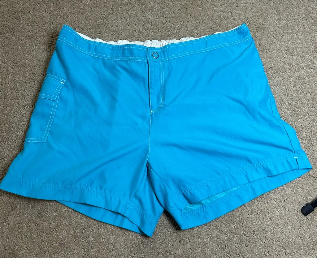Brand: Catalina Style: Swim Shorts / Board Shorts / Cover-Up Shorts Size: 1X/XG (Equivalent to US Women's Plus Size 16W) Color: Bright Aqua Blue / Turquoise Blue Material: 100% Polyester Shell (Quick-Dry Fabric) These versatile and comfortable Catalina swim shorts are perfect for the beach, pool, or as a summer cover-up. • Closure: Features a functional zip fly and a snap-button closure for a secure fit, offering a more tailored look than simple pull-on shorts. • Waistband: Part elasticized waistband (elastic on the back) for comfort and flexibility. The front is a flat waistband for a smooth appearance. • Pockets: • Front left cargo-style pocket with a flap. • Back right patch pocket with a flap and drainage grommet.