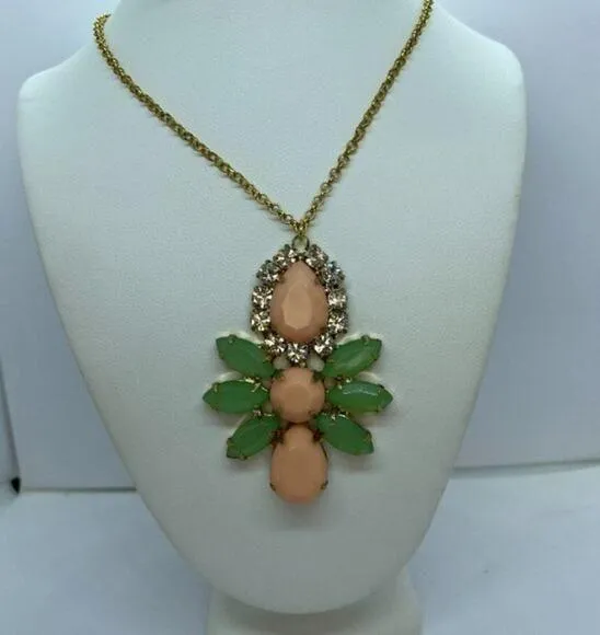 Gold-Tone Pink & Green Gemstone Rhinestone Necklace Gold-tone hardware with pink & green colored gemstones – clear rhinestone detail. Lobster clasp closure New – Hand assembled Necklace drop: 11” Pendant: 2” x 1.5” (widest section) 146