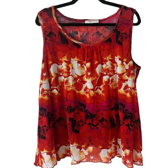 Cato Red Floral Tropical Sunset Drapey Pullover Sleeveless Blouse. Bright and colorful with a soft b... Show more