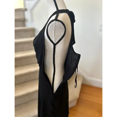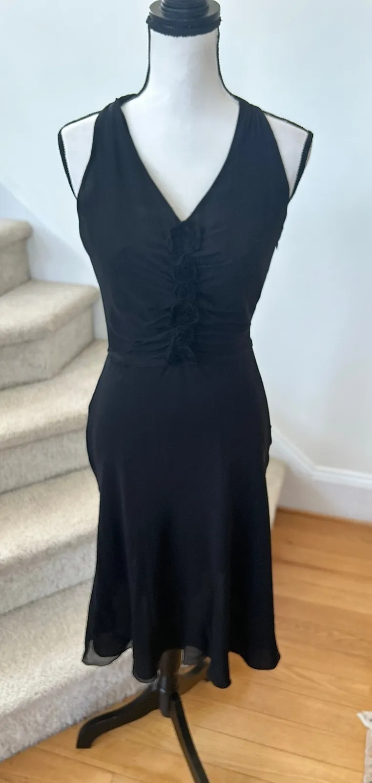 Excellent NWT condition. Black silk, halter neck style with tie at neck. V-neck with rosettes. Fitte... Show more