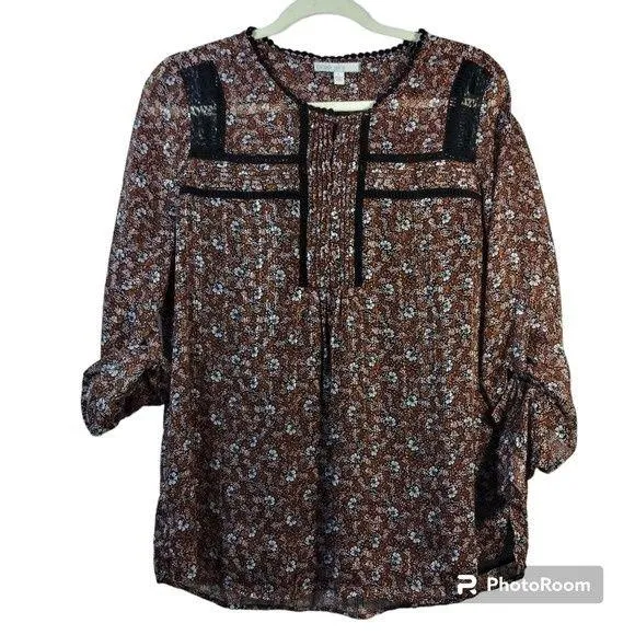 Pale Sky Brown Floral Roll Tab Sleeves Boho Blouse Size L Long sleeve with button cuffs Roll tab sleeve feature 1/4 button front Lace inlet Light weight Lined Gently worn approximate measurements pit to pit 20" length 25"