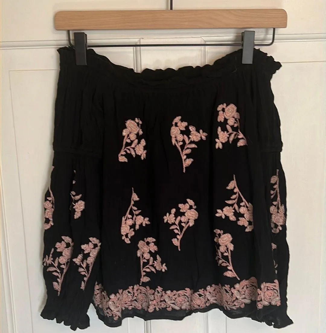 American Eagle black off the shoulder top with pink embroidery detail. Three quarter sleeves. Size X... Show more