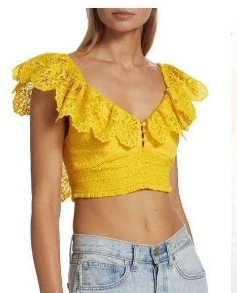 Alice + Olivia's Bleeker crop top is adorned with ruffled lace trim and a smocked waist. V-neck Cap... Show more