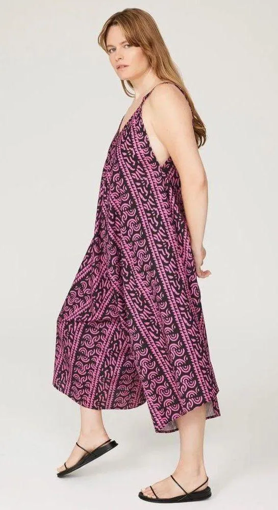The beachy caftan meets a breezy jumpsuit in this pull on playsuit by Kahindo. Purple tie-dye cotton (100% Cotton). Jumpsuit. Sleeveless. V-neck. Pull on. 56" from shoulder to hemline. 26" inseam. 21” chest. 20" rise. 23" leg opening. Imported. Great used condition - no flaws or signs of wear