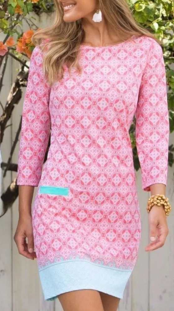 Cabana Life Coral Upf 50 Coral Tides Mini Shift Dress Teal Trim Size Small NWT. Comfortable, wrinkle-resistant UPF 50+ fabric, this 3/4 sleeve dress is perfect for everyday wear and an ideal versatile cover up for your vacation. Elbow sleeves. UV protection, water resistant fabric provides stretch, 1 front slip pocket with snap, printed medallion, design, jewel neck, 36in long, taken from size S pull on. nylon/spandex, machine wash. Cruise wear, vacation, travel, vacay, summer, swim, resort wear, water, pool, lake, surf, boating, tanning, sunbathing, coverup Sun protection skin protective sun cancer Sport Sporty Athletic Tennis Golf Walking Surfer, skater, sk8, VSCO, beachy, valley girl, coastal, tomboy, modest, nautical, or beachy, minimalist, industrial, norm core, practical, basic, solid, coastal grandma, minimal, simple, modern, tennis golf classy, utility, practical, granola girl, hiking, camping, outdoor, walking, trail, athleisure, lounge, comfy, comfortable, cozy, stretchy, activewear active wear
