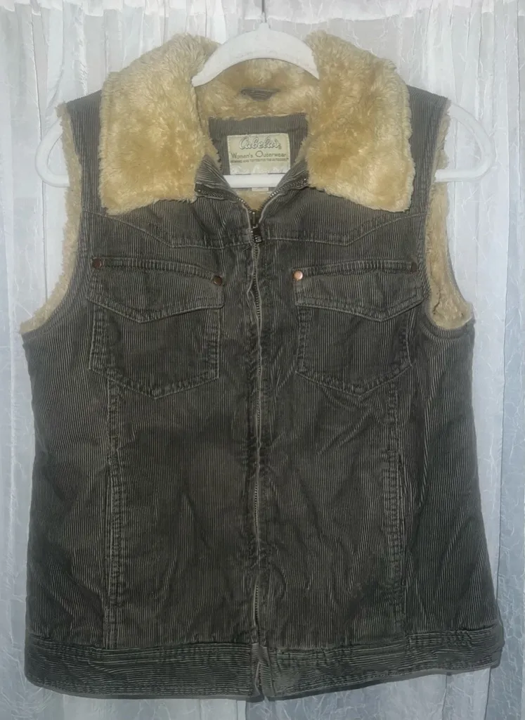 Cabela’s Corduroy Sherpa Trucker Vest Olive Chore Barn Ranch Utility Western in size medium. EUC. No flaws. Cabela’s Corduroy Sherpa Lined Trucker Vest Olive Chore Barn Ranch Utility Western. Features: -trucker style sherpa lined corduroy vest-mineral washed, lived in look to it -sherpa point collar -zip placket -2 side slit pockets -2 chest patch pockets with flap and snap closure -2 inner pockets to hold your phone -2 snap cuffs -tonal stitching -has a vintage, lived-in hobo chic trucker vibe to it -inner faux fur sherpa lined -dark olive green -shell 100% cotton, lining 100% acrylic 90s, 00s, Y2K, y2k, trucker, corduroy, vest, lined, cozy, trending, fall aesthetic, fall, winter, indoor, outdoor, statement, going out, flattering, up north, hiking, camping, cabincore, cabin, ice fishing, grunge, chores, barn, rodeo, transitional season, coastal cowgirl, chore vest, utility, streetwear, rugged, tomboy femme, barn, equestrian, western, ranch