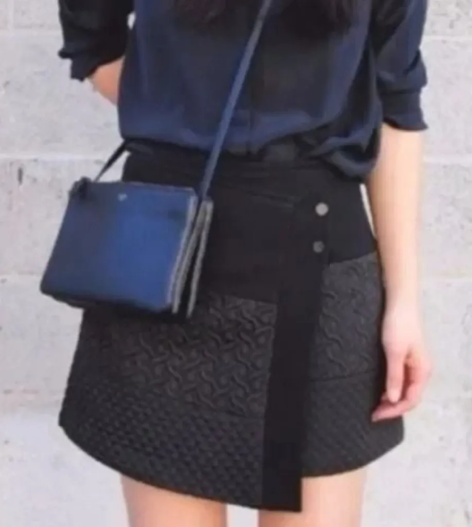 Fully lined. Mini front pocket. Asymmetric hemline. 3 different sections of quilted, textured design... Show more