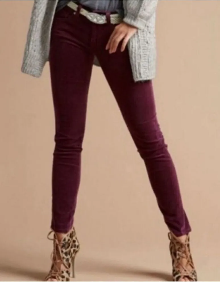 CAbi corduroy, burgundy, colorful, artsy, ankle skinny jeans. Pairs well with a tee or blouse and fl... Show more