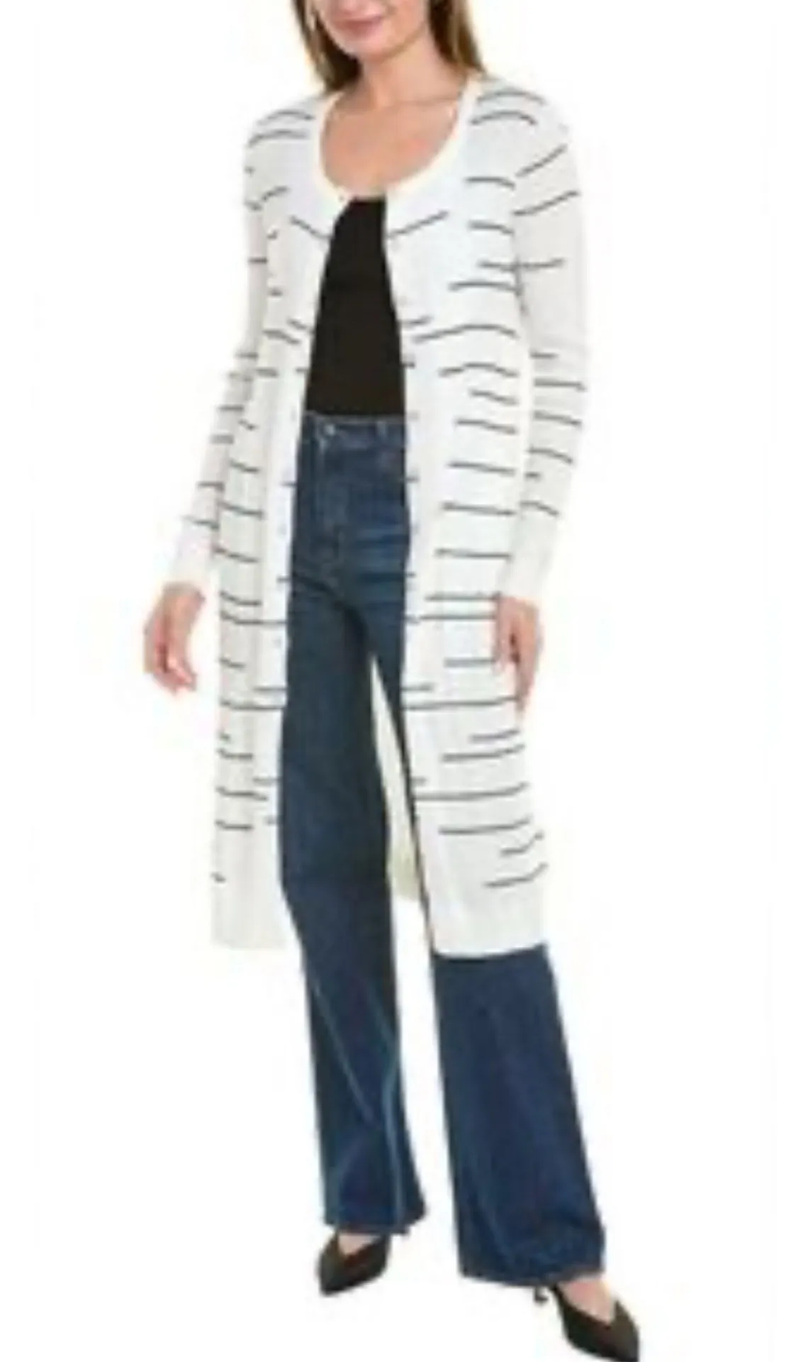 Cabi Dash Stripes Ribbed Midi Cotton Blend Cardigan Size S Color: white and black Measurements L... Show more