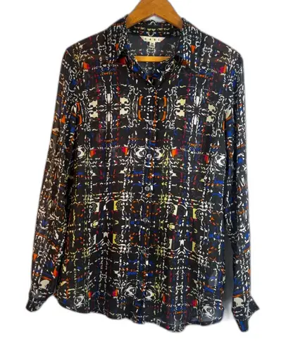 Gray with multicolor patterns Collar, long sleeve, button front, button cuffs, semi sheer Polyes... Show more
