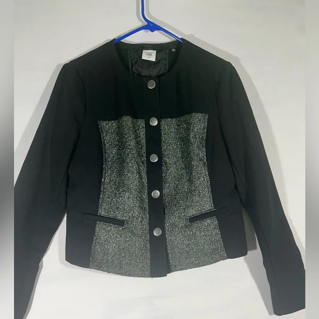 Sophisticated Chic Textured CABI blazer in black and gray. Features striking silver buttons. Ideal f... Show more