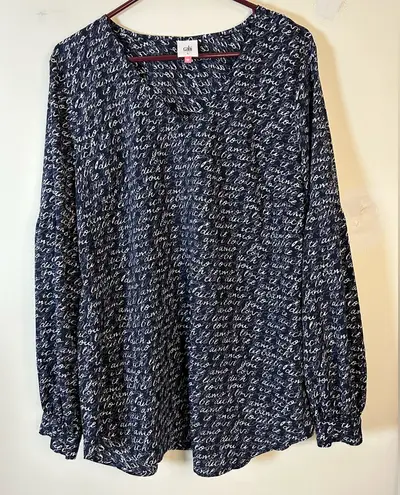 Elegant navy blouse with white script design. Ideal for versatile wear. Cabi Te Amo, Love script... Show more