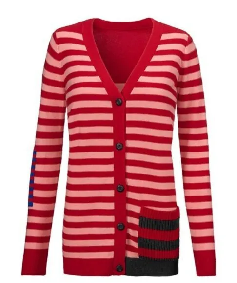 Cabi Picnic Cardigan Red Pink Striped V Neck Sweater Knit Pocket Long Sleeve Size: XS Measurements... Show more