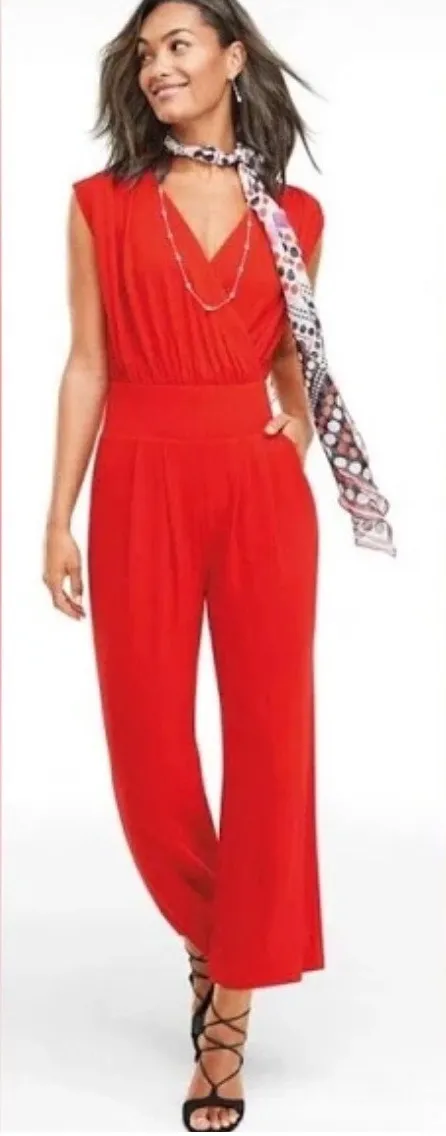 Stunning CAbi Red Uptown Jumpsuit (Style 5773) in size M. This vibrant, ultra-flattering jumpsuit fe... Show more