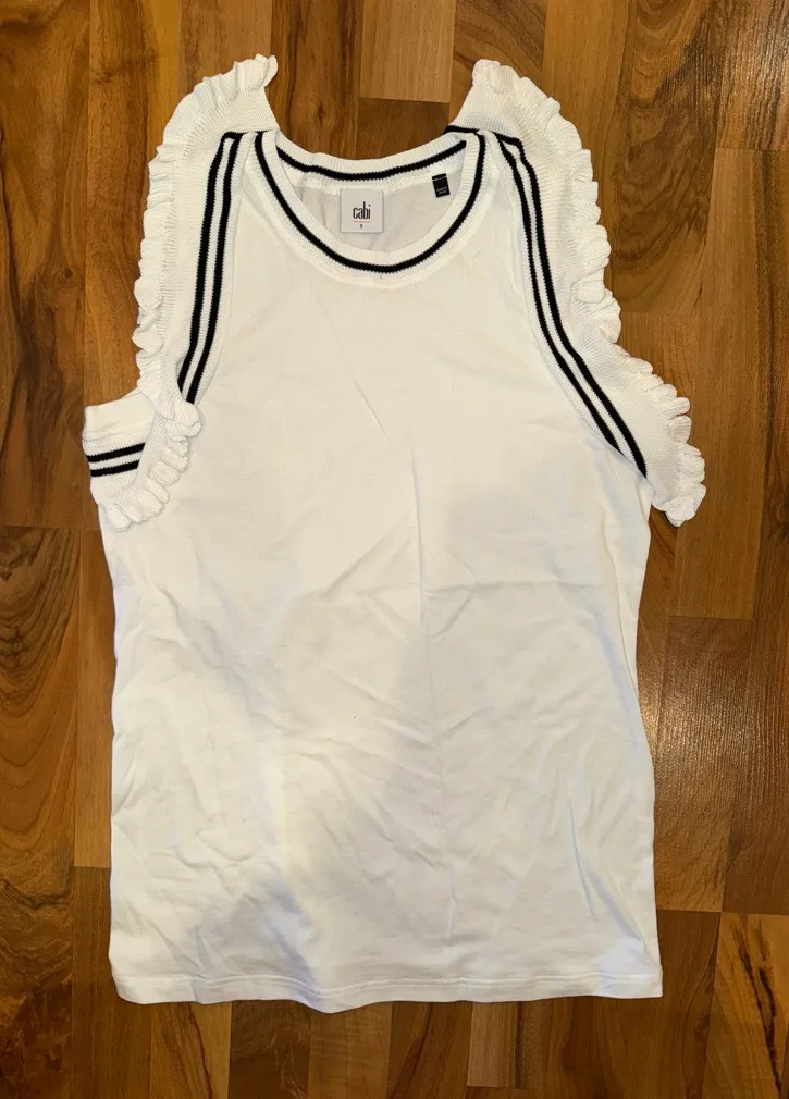 cAbi ruffle tank top women’s size white and black cotton, spandex viscose small EUC like new Ligh... Show more