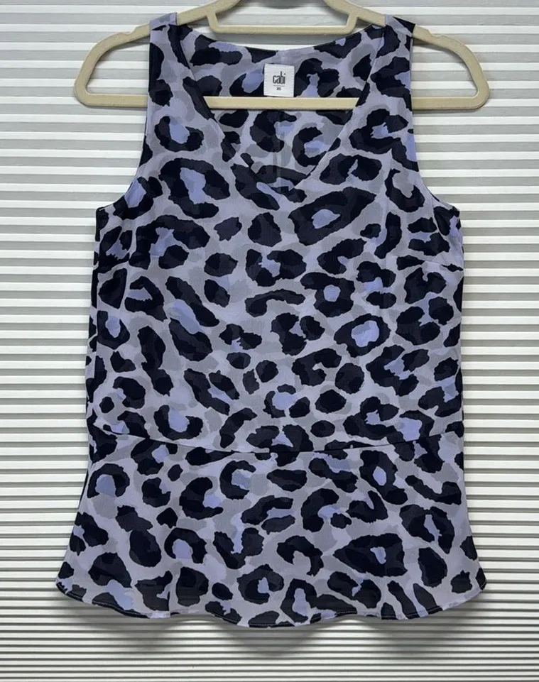 CAbi Vivid Violet Feline Leopard Print Sleeveless Peplum Blouse Top Style #5536 100% polyester Si... Show more