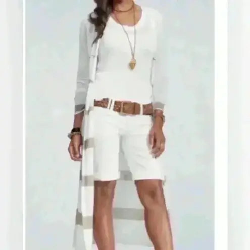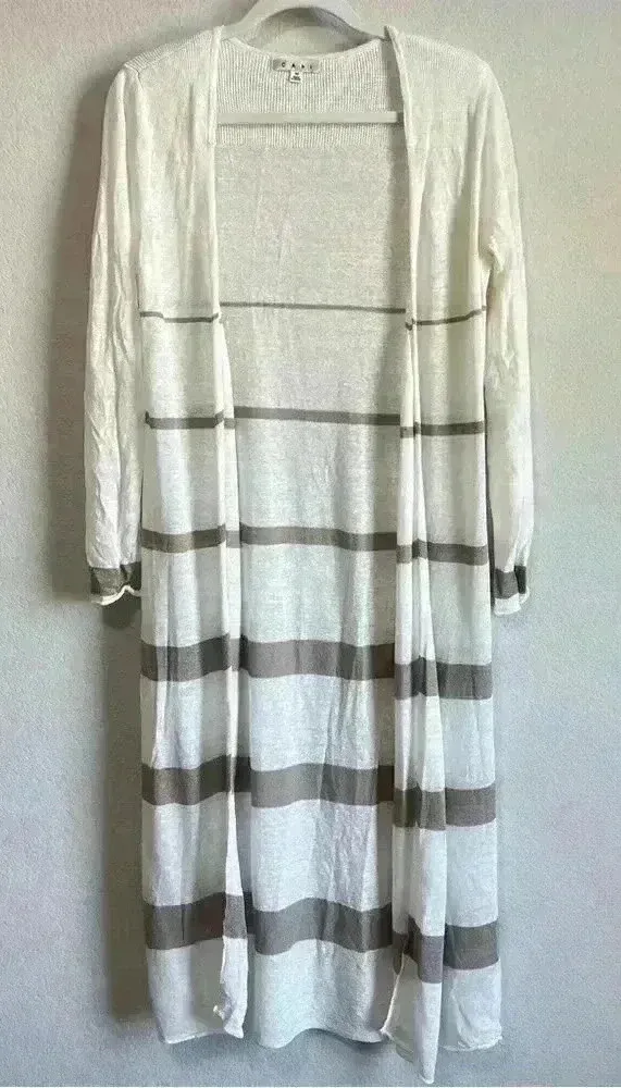 CABI Bon Voyage Riviera Long Duster Sweater Taupe White Linen Cardigan in excellent preowned conditi... Show more