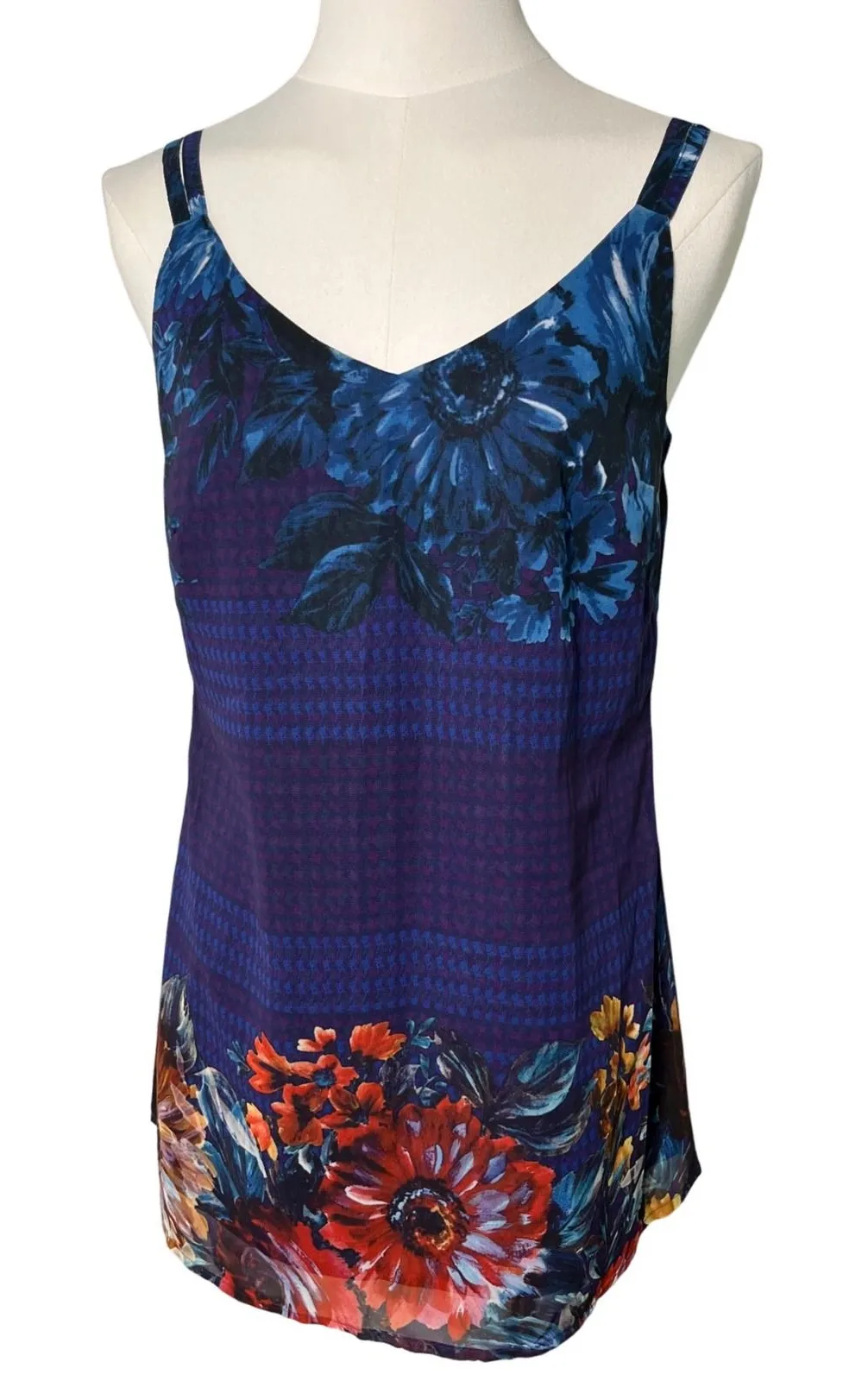Cabi sleeveless floral V-neck blouse in a rich purple and blue palette with hints of red at the hem.... Show more