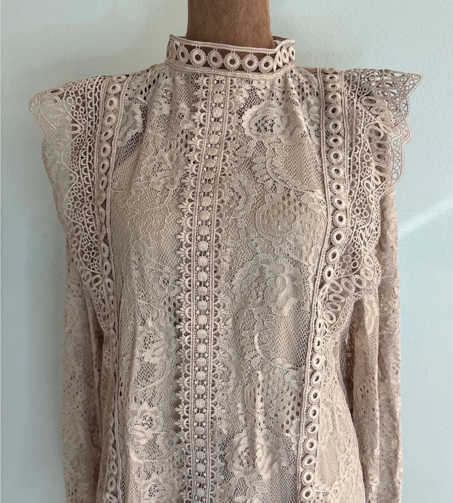 Adorn yourself in enchanting elegance with this stunning Cable & Gauge lace blouse. Delicately crafted with intricate lace overlays, this top features a sophisticated mock neckline and charming ruffle sleeves that add a touch of feminine flair. The long sleeves are finished with ruched detailing at the cuffs, creating a refined silhouette. A hidden back zipper ensures a smooth fit. Perfect for a romantic dinner date or a stylish evening out. Vwo Measurements: • Bust: 19 in • Waist: 18 in • Length: 25 in • Sleeve Length: 23 in Type: Blouse Department: Women Style: Tunic Material: Polyester Blend Neckline: High Neck Sleeve Length: Long Sleeve Sleeve Type: Classic/Fitted Sleeve Pattern: Solid Accents: Crochet, Ruffle Features: Sheer, Lined Fit: Classic Fabric Type: Lace Occasion: Party/Cocktail, Casual Closure: Pullover Season: Spring, Fall Keywords: lace blouse, mock neck, ruffle sleeves, ruched cuffs, sheer lace, elegant top, feminine fashion, evening wear, date night outfit, special occasion, boho chic, romantic style, statement blouse