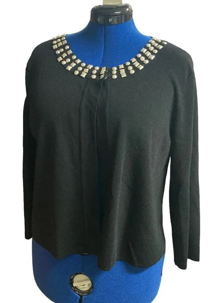 BRAND: Cable & Gauge CONDITION: Good Pre Owned SIZE: XL MATERIAL: 62% Viscose, 38% Nylon OTHER DETAILS: Beaded neckline, 3/4 length sleeves, Two hidden snaps close at top. COLOR: Black MEASUREMENTS: See Pictures Please see approximate measurements in pictures before purchasing. Use your own judgment as to the fit. Send me an offer. I will either accept or counter! W25,14B